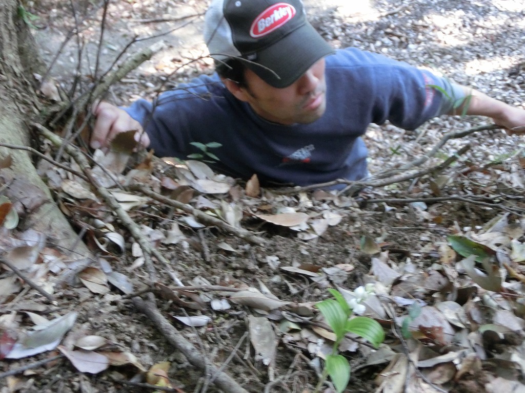 諦めて戻ることにしたのですが、もと来た場所に戻るのではなく、そのまま急斜面を下れば山道にぶつかるので、そのまま下り、