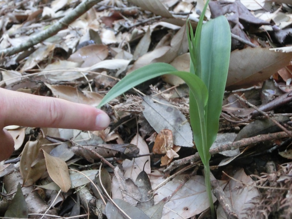 少し明るいですが、雑木林風なので、ミヤマウズラでもあるかもしれないと辺りを見渡すと、長細い葉が中心から複数出ている草が
