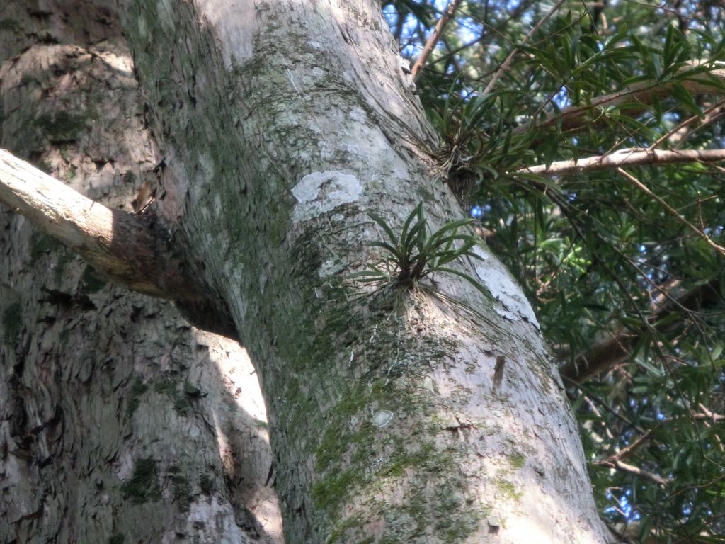 すると、7~8mほどの高さの所に、何やら着生しているものを見つけました。ノキシノブのようにも見えますが、