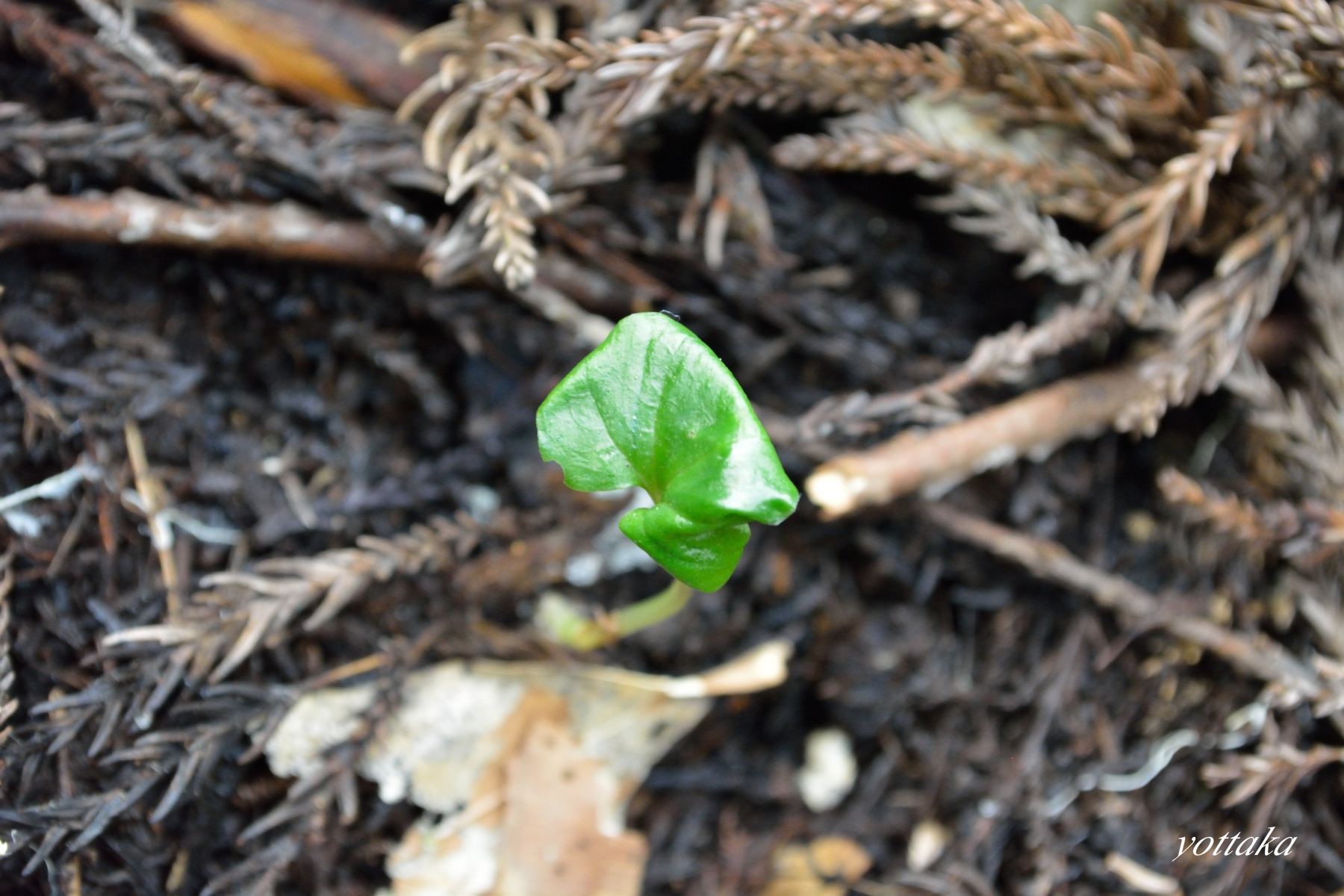 諦めて僅かに残った獣道のような林道を上がろうとすると、何やら黄緑の植物を見つけました。