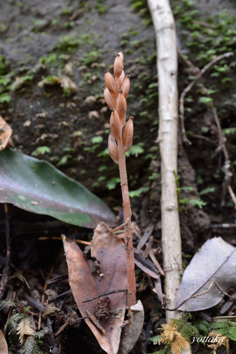 雨が降って開花更新できなかったので、見つける度に恨めしそうに眺めていたら、葉が見当たらない果実を付けたシュスランらしきものがありました。