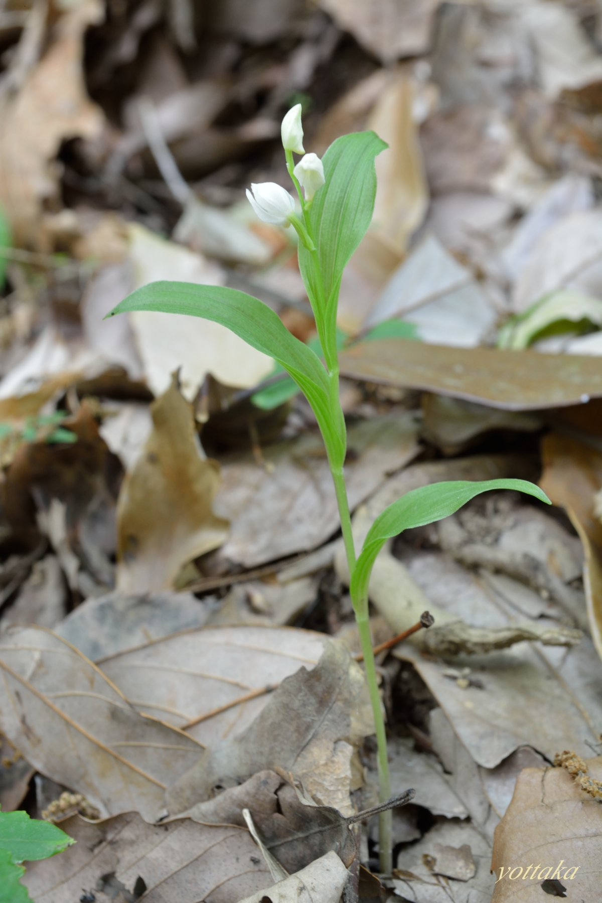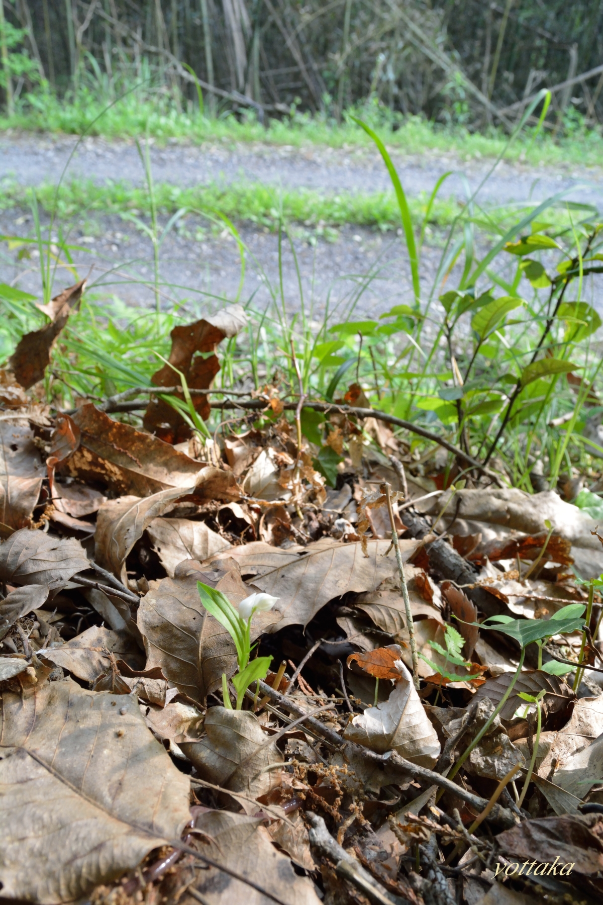 キンランでも咲いてないか山中の土手を確認すると、何やら白い点のようなものが見えました。
