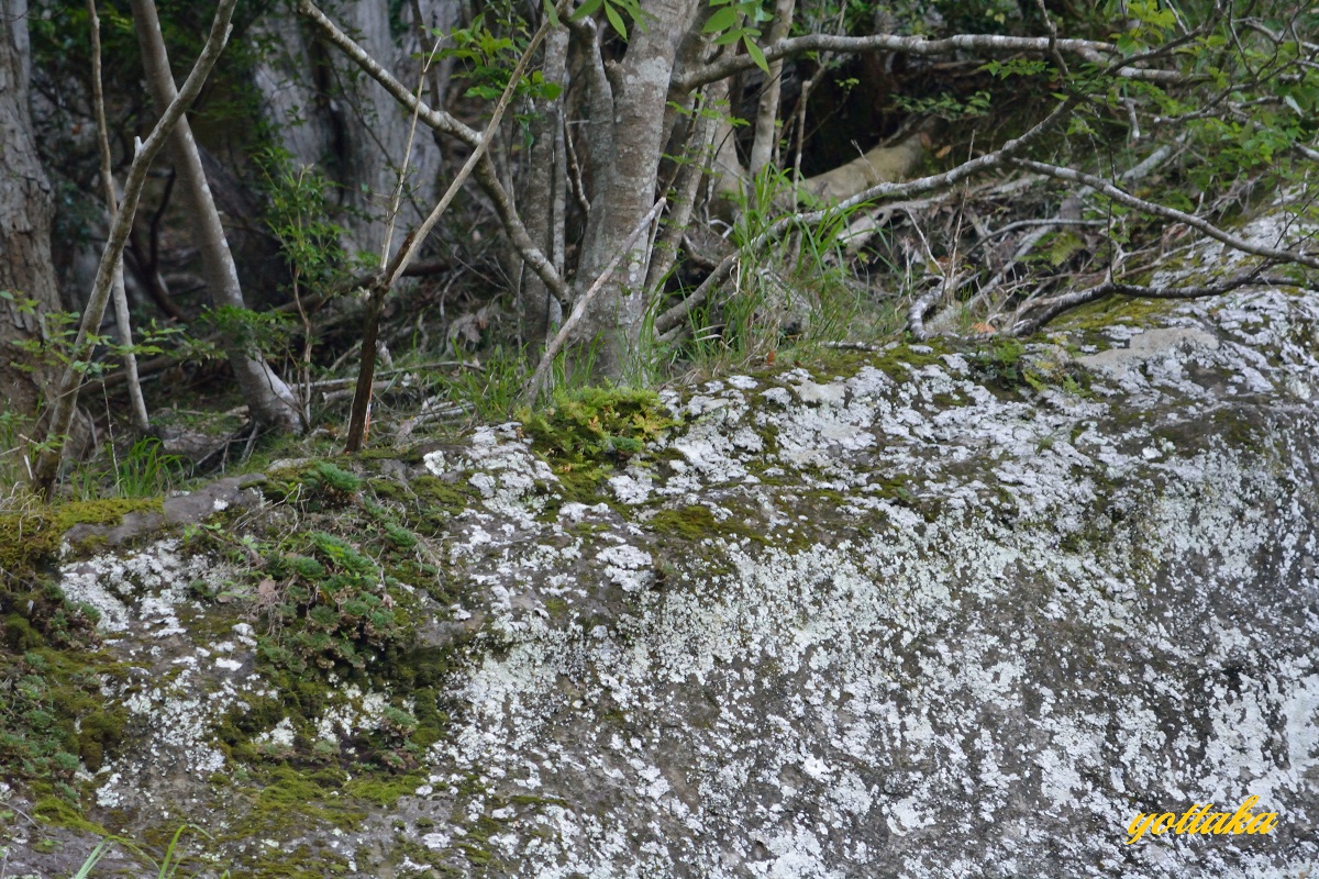 最初の場所は垂直に近い岩盤地帯で、肉眼では花らしきものは見当たりません。
