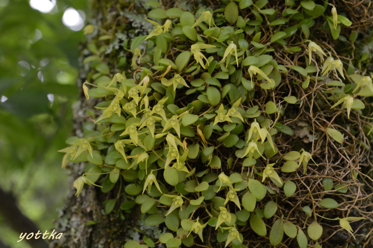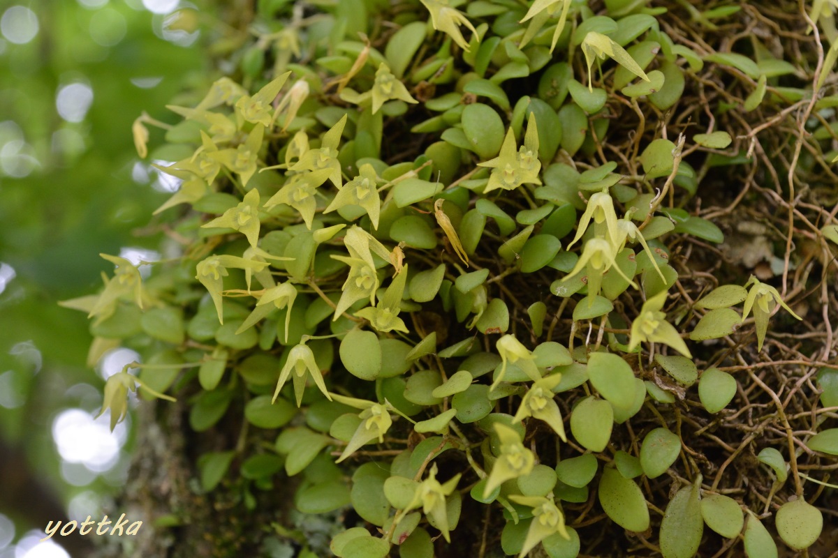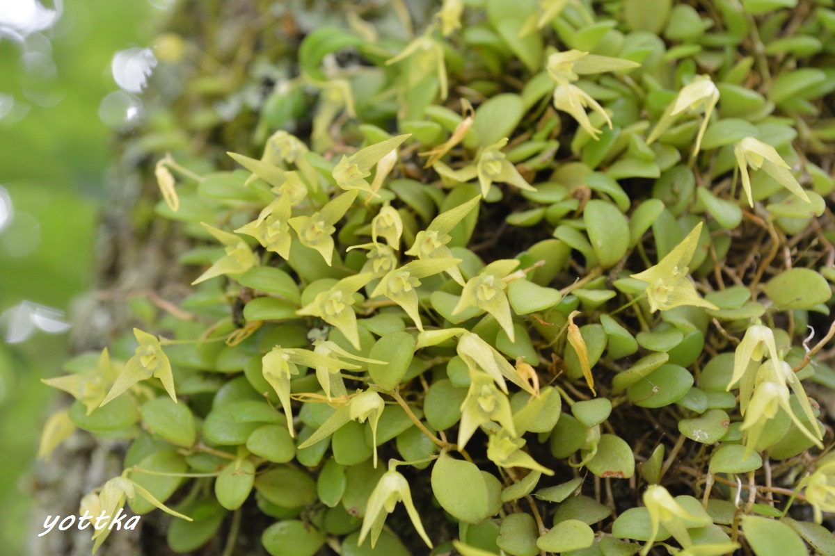 3年ほど前に落ちて瀕死の状態だったマメヅタランを、カヤランが自生している梅の木にダメ元で着けてみたのですが、 元気に花を咲かせました。